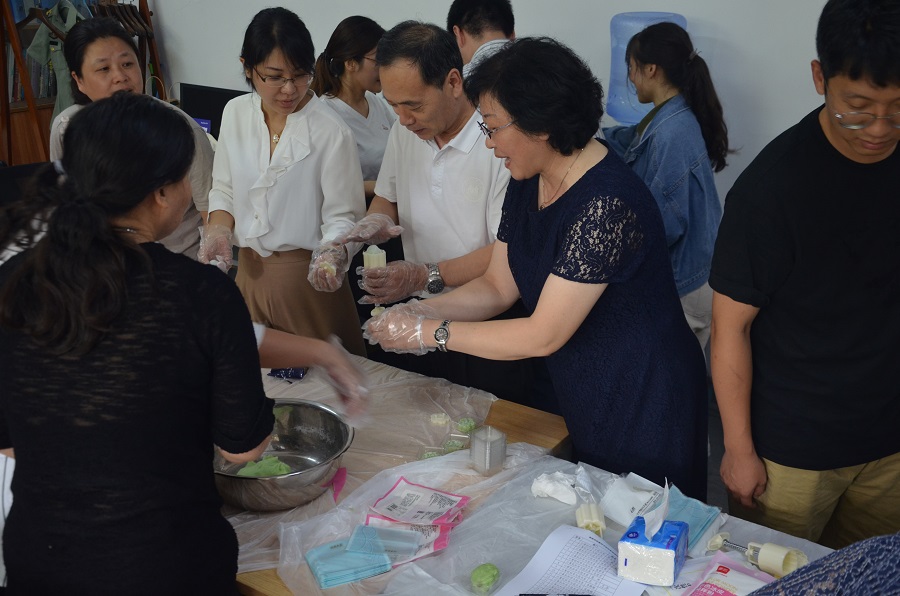 月饼制作环节则是集知识、实践和美食于一体,段校长与老师们一起参与了冰皮月饼的制作,大家精心挑选自己心仪的雕花模具,印出漂亮的形状和印花,一个个模样可爱、五颜六色、精致优美、让人垂涎欲滴的冰皮月饼在大家的巧手下诞生了。通过制作冰皮月饼,参与活动的教职工不仅品尝到自己动手制作月饼的鲜美,而且感受到了中国传统文化的魅力。