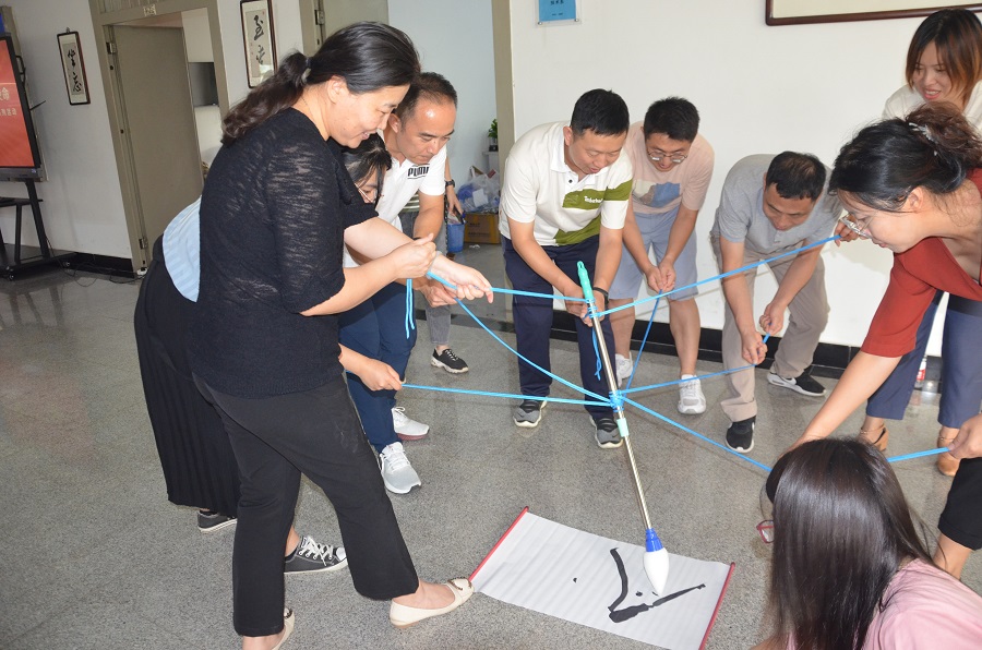 插花和月饼制作之余,老师们还分成两个组,进行团队游戏比拼。“合力搭建”需要小组内每个老师控制着一根绳子,大家一起拉紧绳头来控制塔钩移动,用塔钩将一块块塔吊起垒高。“神笔马良”则在全部绳子的中间绑一根大毛笔,众人齐力控制大毛笔在卡纸上写下“AI”。两项游戏既考验团队成员的团结协作能力,同时也对每位成员的专注与耐心提出要求。