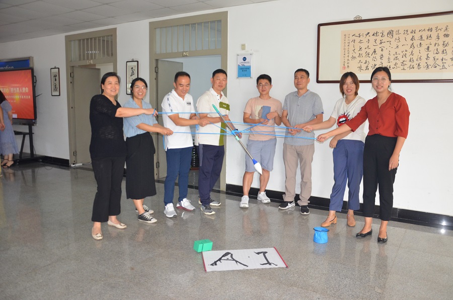 插花和月饼制作之余,老师们还分成两个组,进行团队游戏比拼。“合力搭建”需要小组内每个老师控制着一根绳子,大家一起拉紧绳头来控制塔钩移动,用塔钩将一块块塔吊起垒高。“神笔马良”则在全部绳子的中间绑一根大毛笔,众人齐力控制大毛笔在卡纸上写下“AI”。两项游戏既考验团队成员的团结协作能力,同时也对每位成员的专注与耐心提出要求。